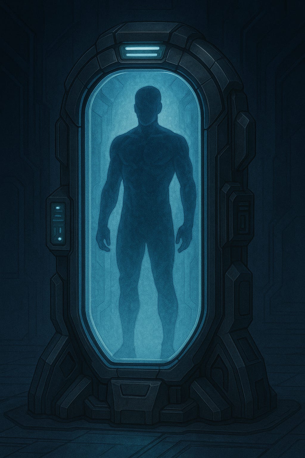 Finally, they arrived at a set of double doors, larger and more ornate than the others he had passed. They slid open with a soft hiss, revealing a large chamber bathed in an eerie, cold light. The room was stark and brutal in its design, with sharp angles and steel plating lining the walls. At the centre of the room stood a raised platform, upon which rested a cryogenic pod, its surface covered in frost, barely visible through the mist.