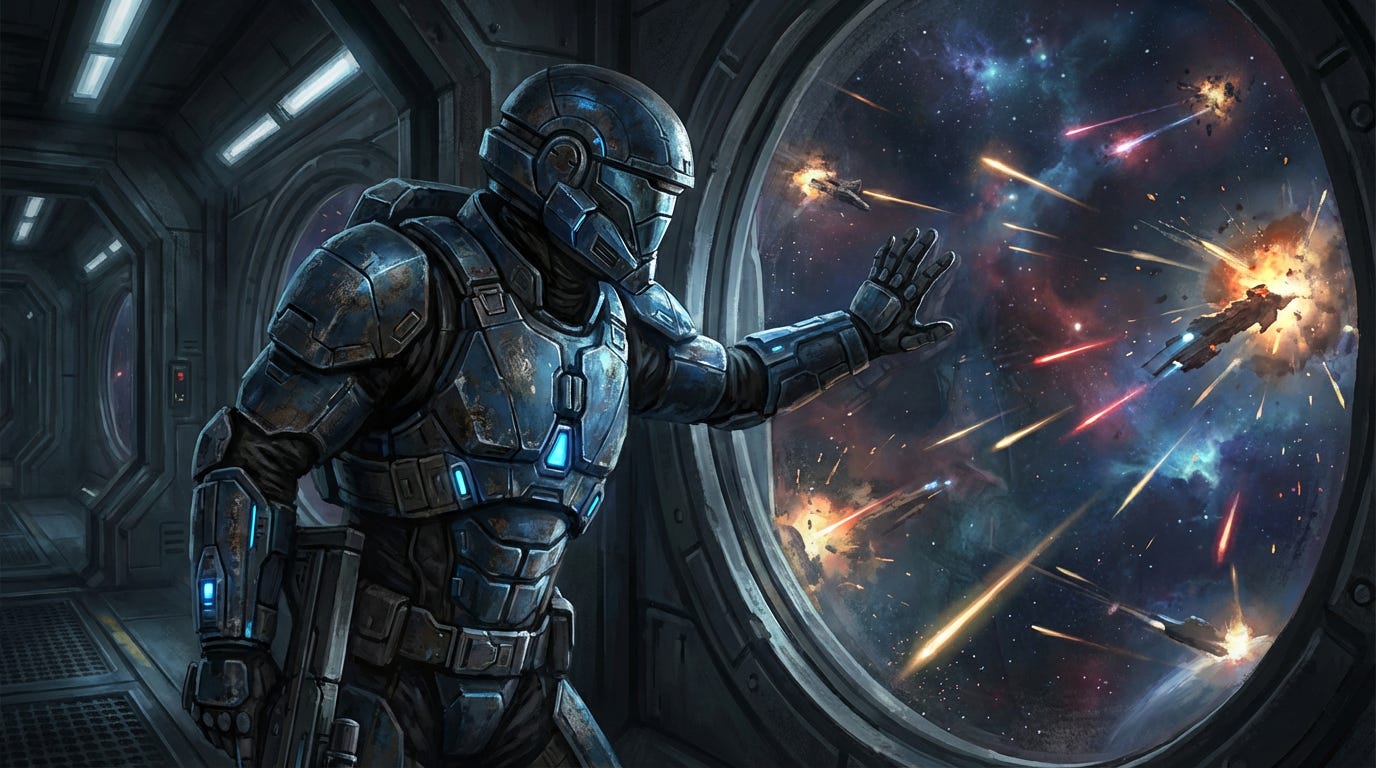The assault shuttle glided silently through the dark void of space, its sleek frame barely visible against the endless black. Inside, the air was thick with tension. Matthews sat at the front, clad in his combat armour, the weight of it reassuring. The shuttle was cold, but sweat clung to his skin as he adjusted his grip on his rifle. The rest of the team was seated around him, each one a silent figure of determination in their own armour, weapons ready.